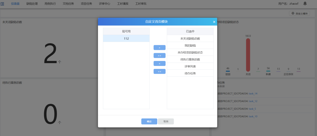 自定义模块,可自定义工作台展示的报告内容,除了系统默认的5个模块外,还可选择在【测试报表-自定义报表】模块自定义的报表,另外,工作台页面最多可展示6个模块;