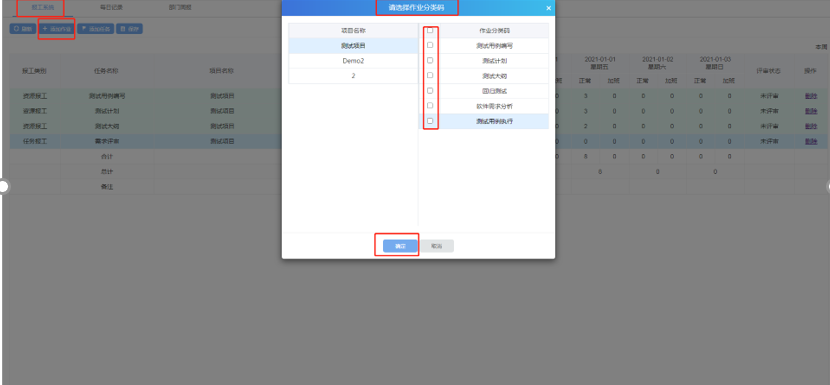 添加作业:选择项目,勾选作业分类码,点击确定,即可在报工界面进行作业报工;