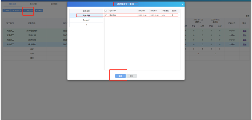 添加任务:选择项目,勾选作业,点击确定,即可在报工界面进行任务报工;