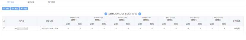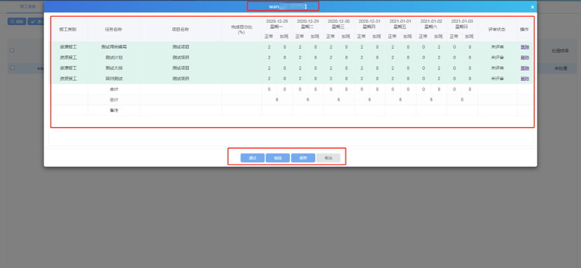 选中项目,会显示项目中所有人的每一周的报工情况,进行审批,点击通过或者驳回,完成审批。(注:粉色标注的代表正常工时未满8小时;黄色标注的代表加班工时);