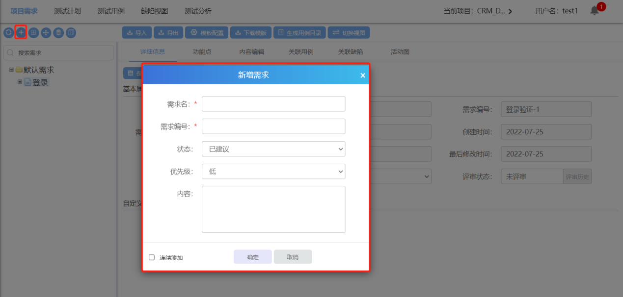 点击【测试需求】进入测试需求模块。这里,我们可以通过两种方法添加需求,一种是通过添加子需求,需求分析,创建需求;另一种是导入需求。