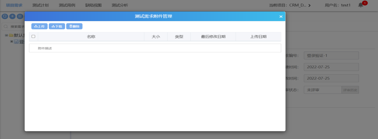 选中一个需求节点,点击附件,弹出测试需求附件管理页面,可以上传、下载、删除附件;选中附件可以输入附件描述,点击保存后添加附件描述成功;