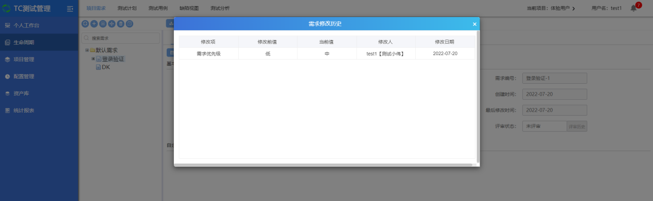 选中一个需求,点击修改历史,可以查看选中的需求的修改历史;其中包括修改项、修改前值、当前值、修改人、修改日期;