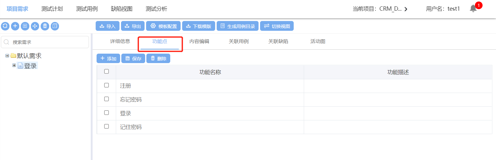 点击添加,输入功能名称、功能描述,点击保存新增功能点成功;