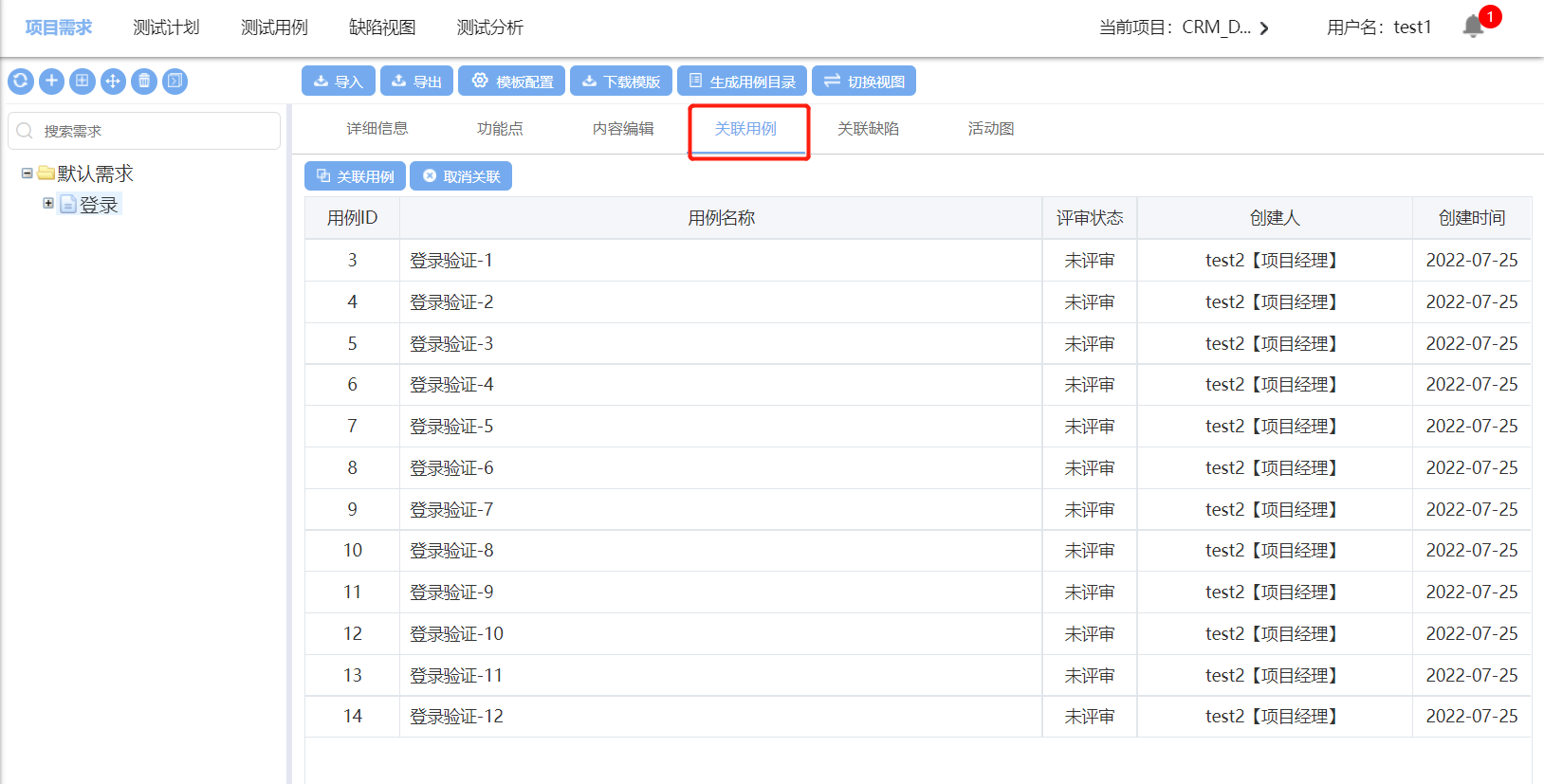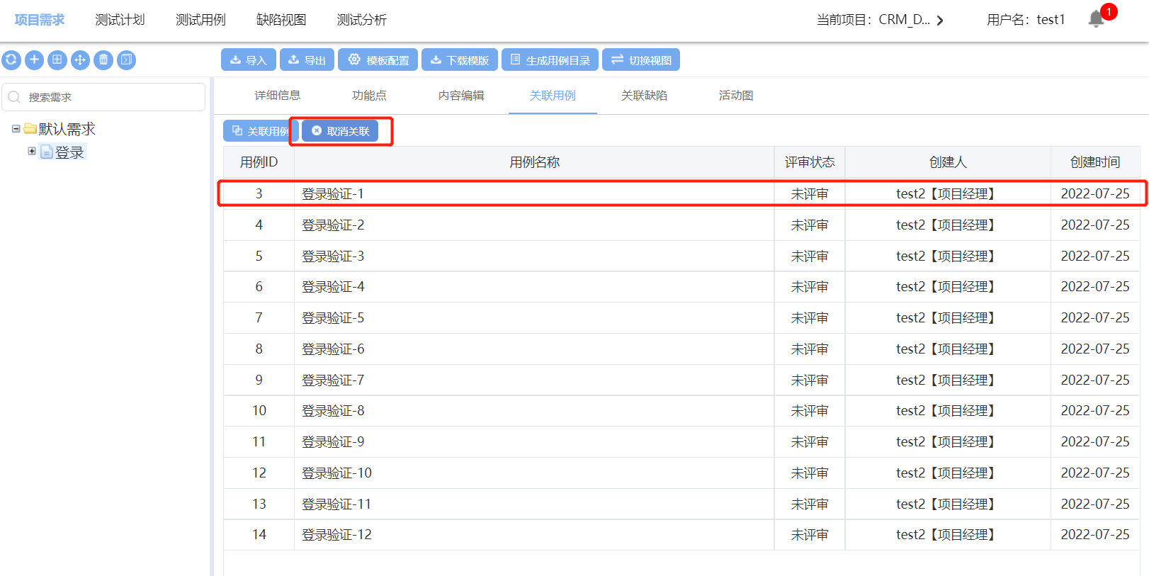 选中一个需求,点击关联用例,勾选用例后,点击确定关联用例成功;(此操作需要需求创建人或需求负责人);