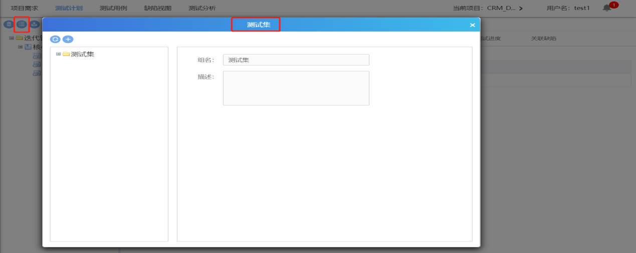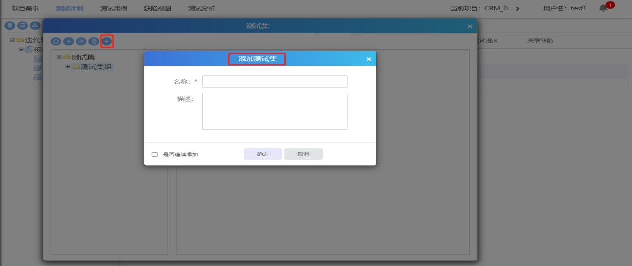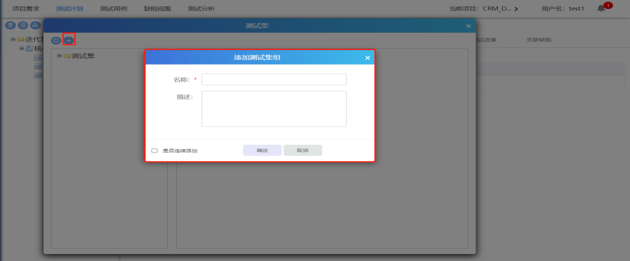 1. 弹出测试集页面,点击新增;输入测试集组名称,确定后新增成功;(如下图)
