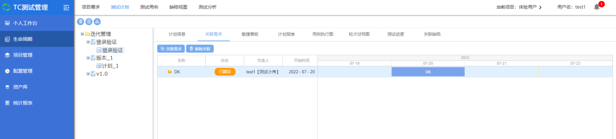 1.关联需求:点击关联需求,勾选需求,确认后关联成功;