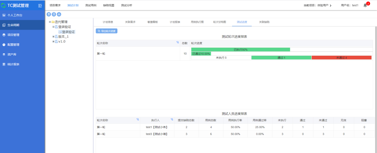 选择测试计划,点击测试进度,可以查看该测试计划下、测试轮次的测试进度;