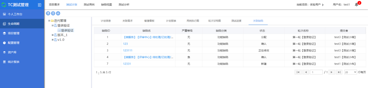 选择一个测试计划,点击关联缺陷,可以查看该需求下关联的所有缺陷;