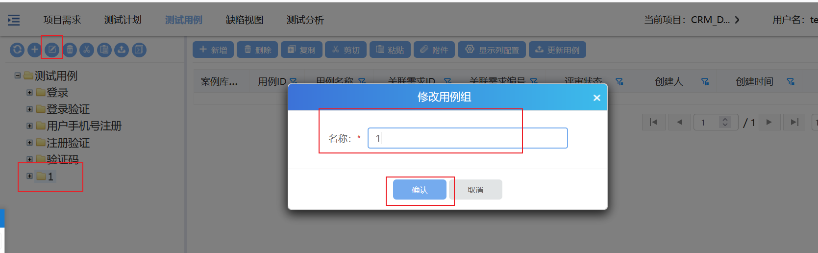 选中一个用例组,点击修改,输入内容后点击确认,用例组信息修改成功;