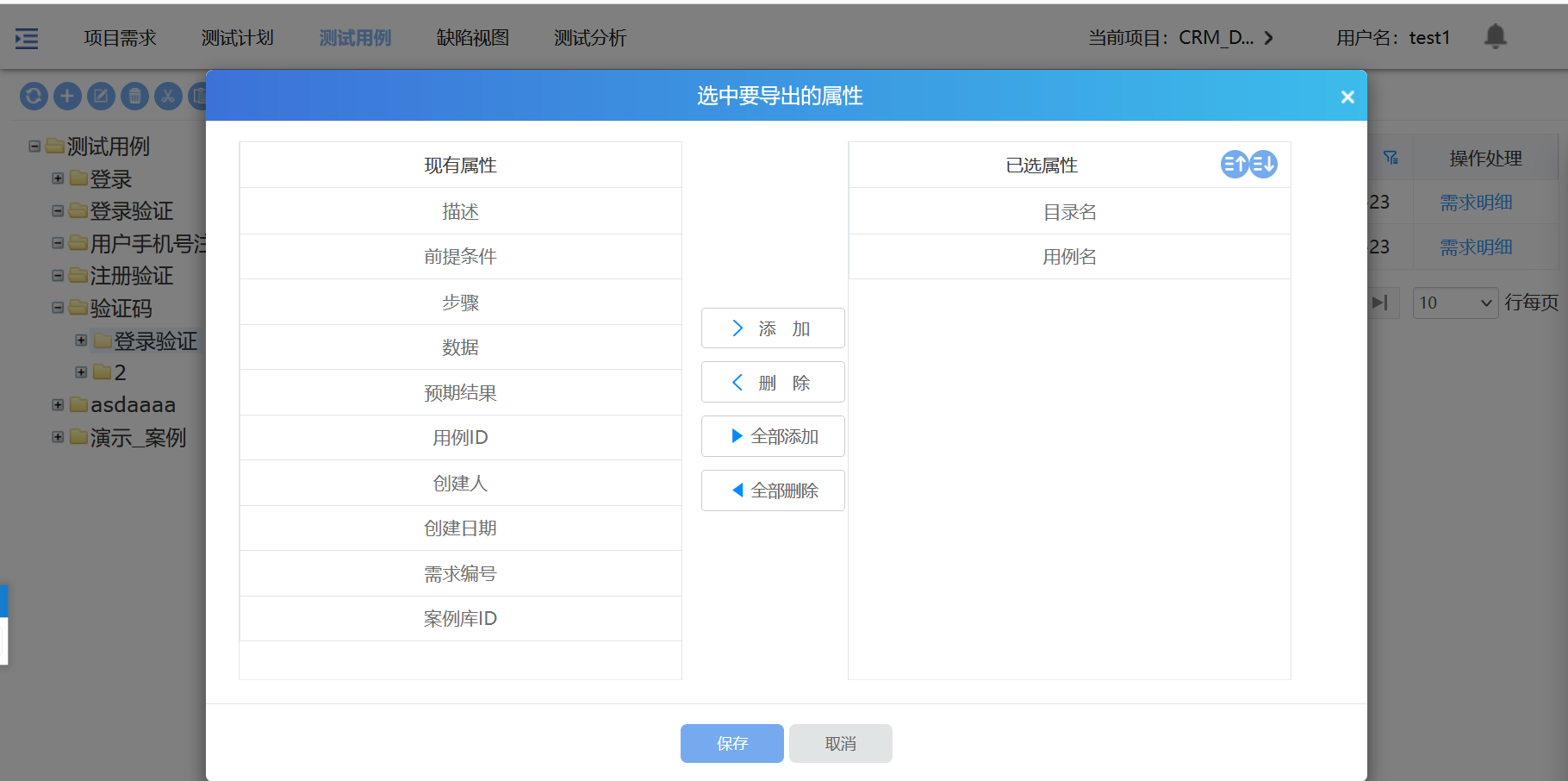 选中用例组,点击导出EXCEL用例,选中属性,点击确定后导出用例成功;
