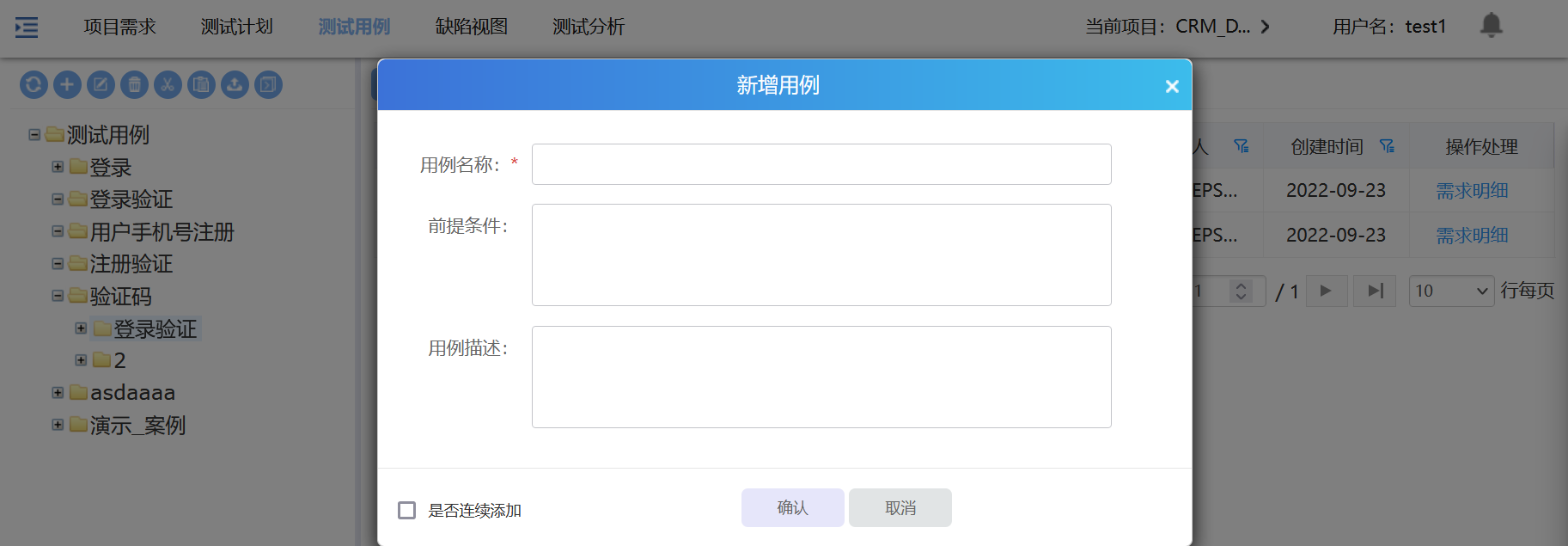 点击新增,弹出新增用例页面,输入必填项用例名称,点击确认新增用例成功;如果创建项目时选择的是需求用例强关联,新增用例时需要选择关联的需求;