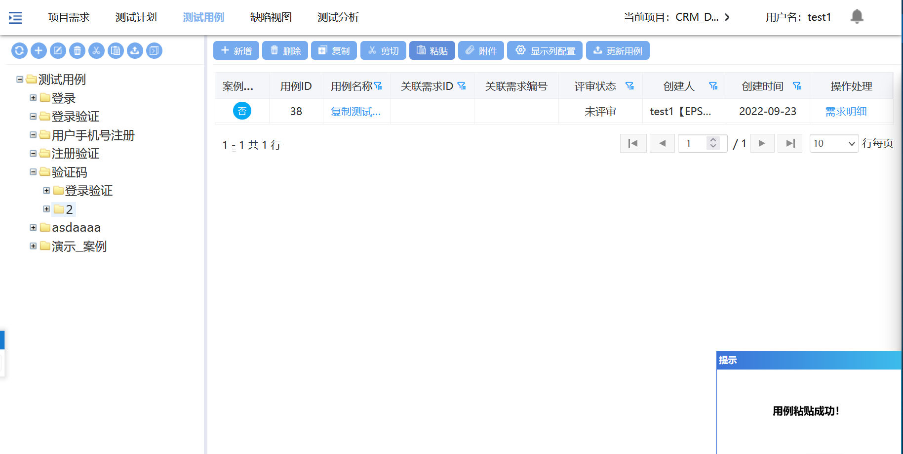 剪切完用例后,重新选择一个用例组,点击粘贴,用例粘贴成功;用例剪切后不可粘贴到原目录;