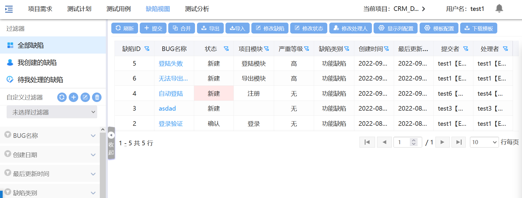点击【缺陷视图】界面进入缺陷管理模块;如下图所示:
