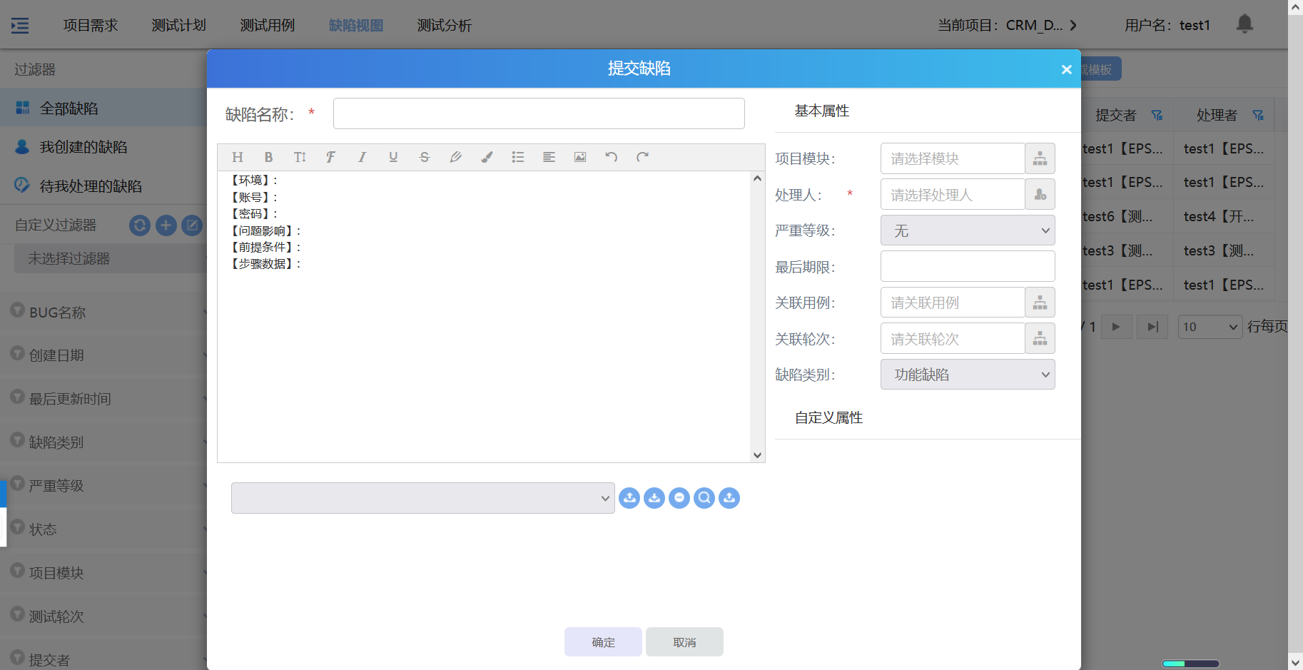 点击提交,弹出新增缺陷页面;