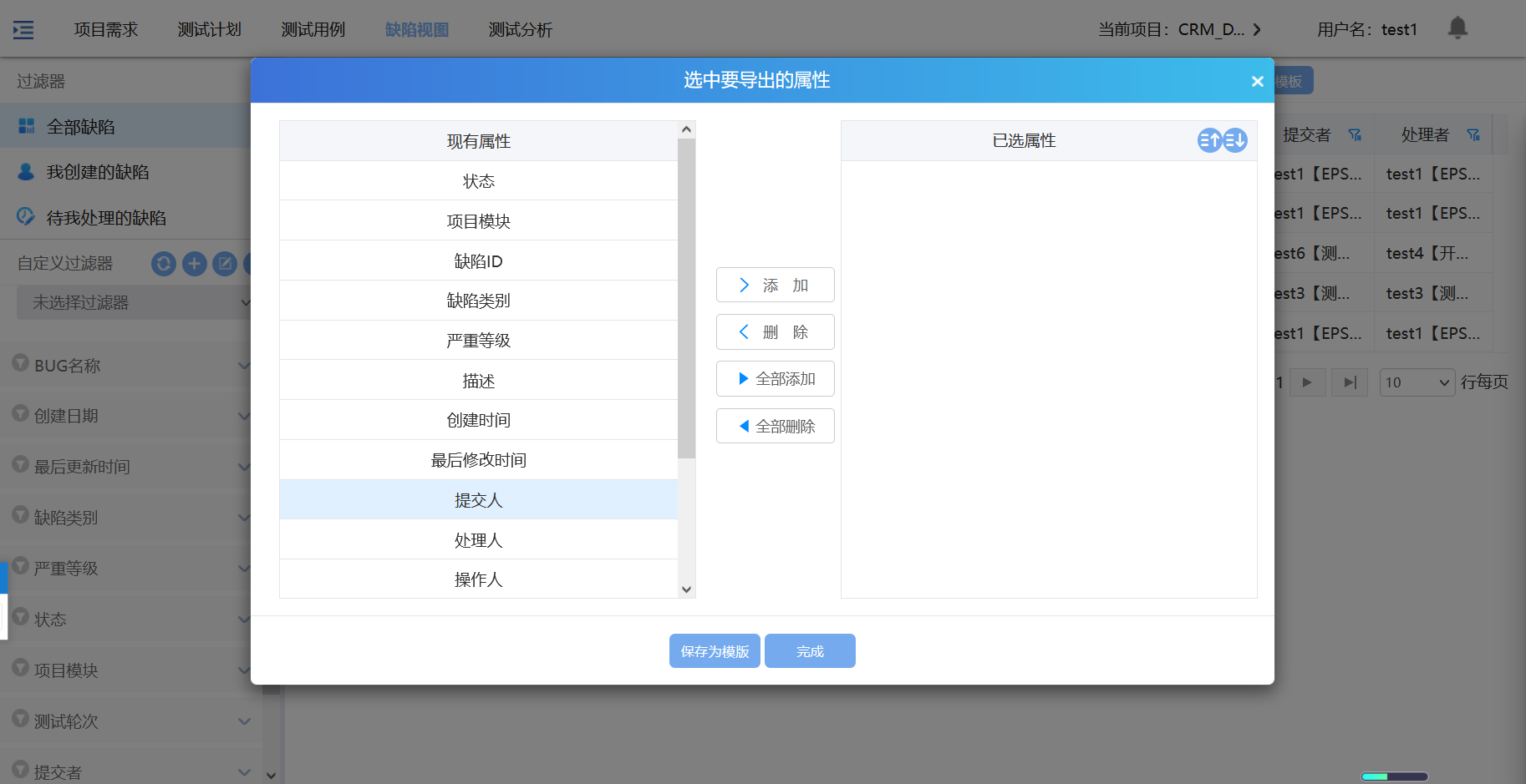 点击导出,选中属性点击添加,点击完成,导出缺陷成功;点击保存模板,模板为保存成功;