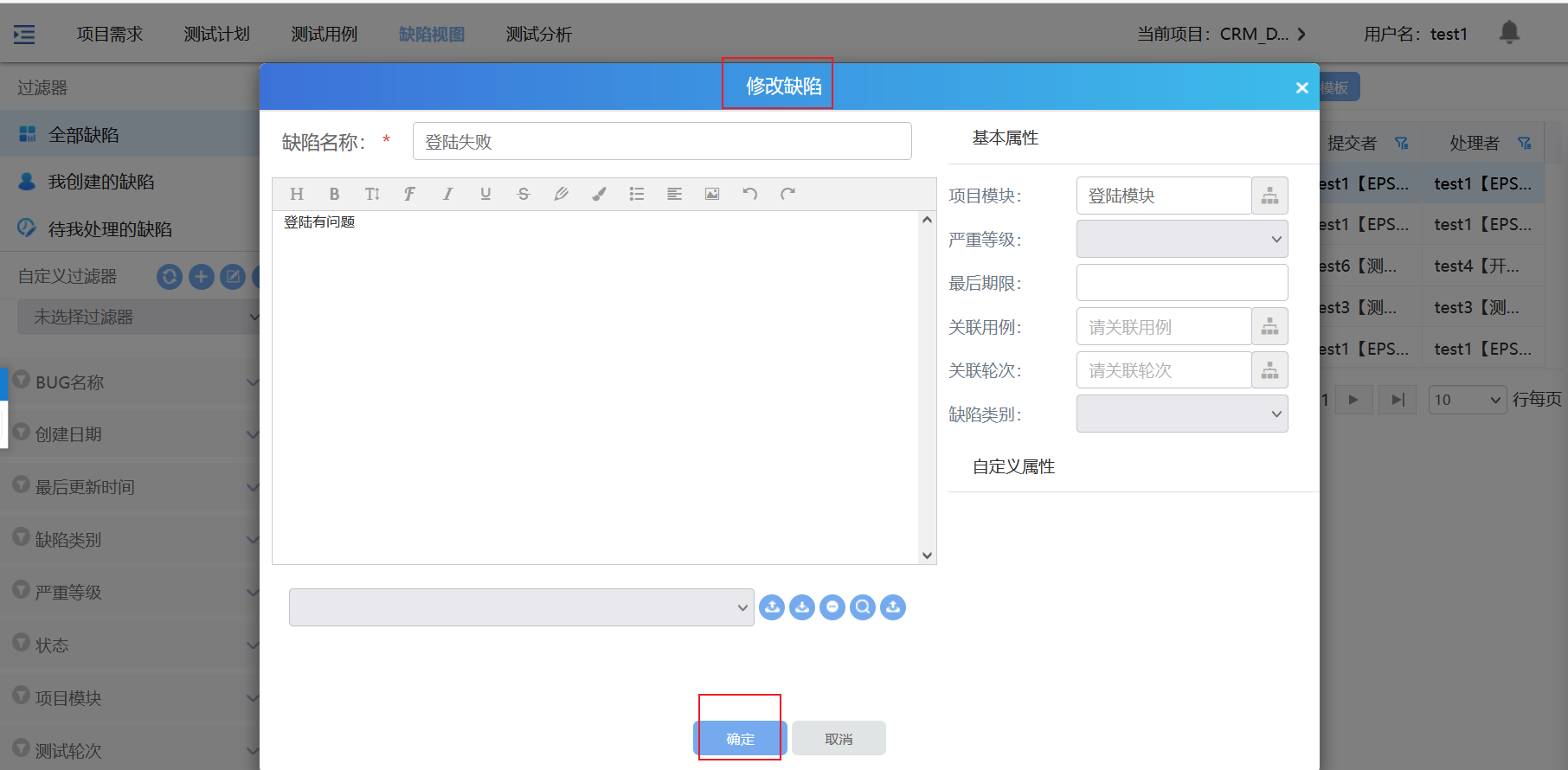 选中一条缺陷,点击修改缺陷按钮,修改缺陷数据,点击确定,即可修改缺陷,可修改缺陷名称、缺陷详情、项目模块、严重等级、关联用例等信息;