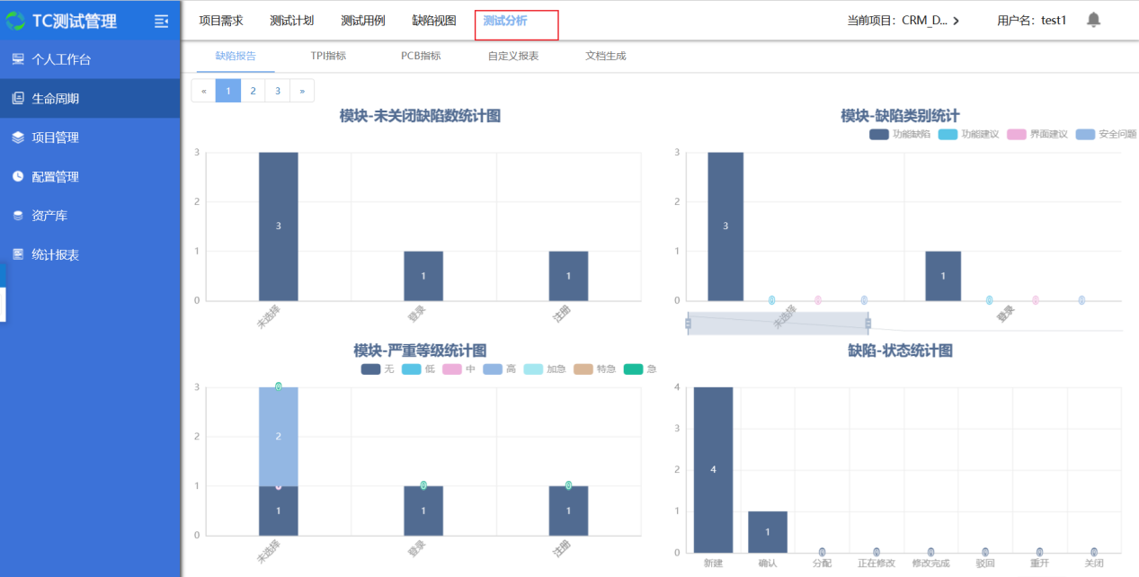 进入测试分析页面,可以查看项项目内的缺陷数量、TPI指标、PCB指标、自定义报表等