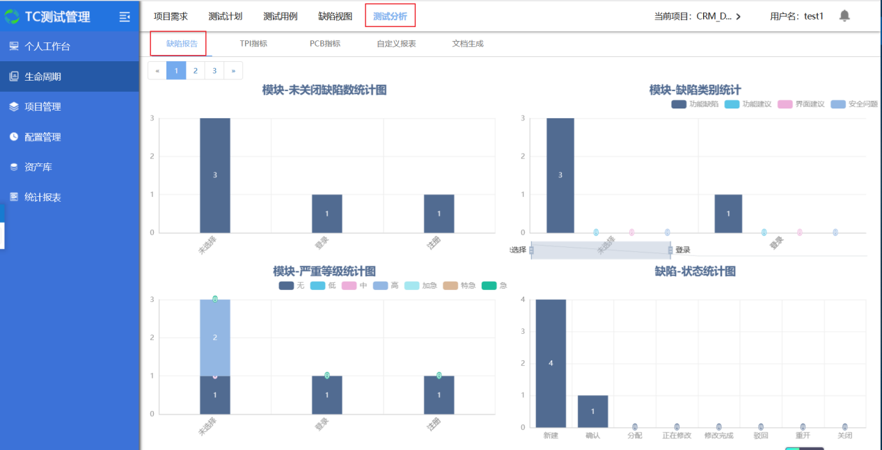点击缺陷报告,可以查看未关闭缺陷数、缺陷类别统计、严重等级统计、缺陷状态统计