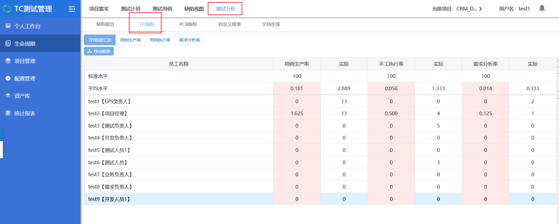 TPI指标:可以查看项目内TPI指标汇总、用例生成率、手工用例执行率、需求分析率;点击导出报表,可以导出数据报表,查看数据信息;
