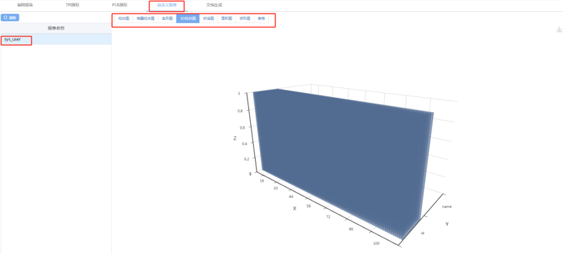 自定义报表:自定义报表根据综合管理--数据项中编写sql语句,来自定义需要查询的报表;然后添加到前台测试项目--自定义报表中;