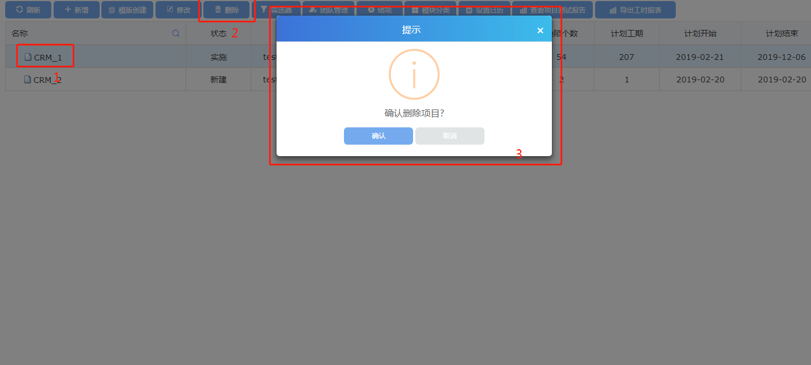选中项目,点击删除,弹出删除提示框,确认后删除成功;