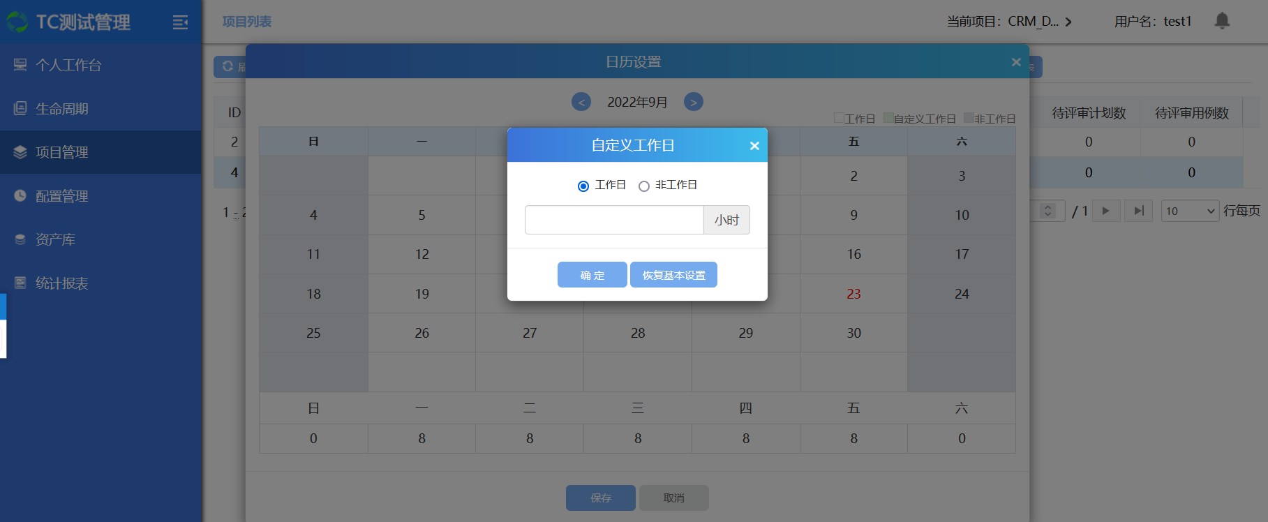 点击【日历管理】进入日历管理模块,日历管理模块主要是作为一个日历模板,可以自定义项目内的工作日工作几小时和非工作日,也可以修改一周的工作时间。