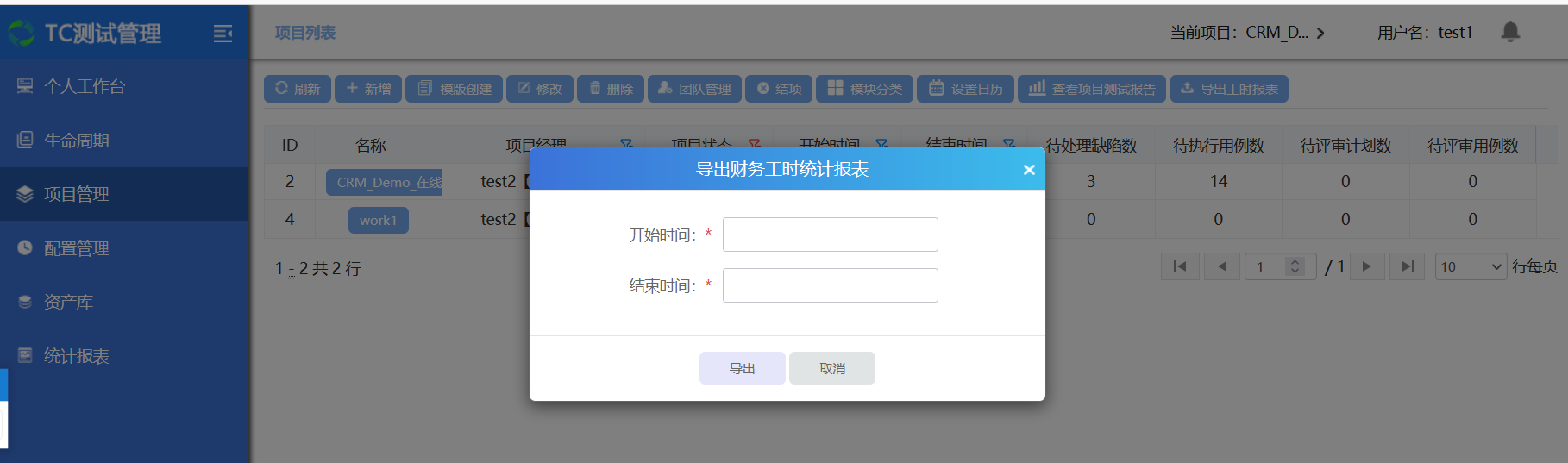 点击导出工时报表,选中开始时间、结束时间,点击导出,导出成功;(注:开始时间和结束时间范围内需已有报工信息);