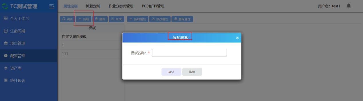 新增模板,点击【新增】按钮,进入到添加模板页面,输入模板名称,点击确定按钮,模板添加完成。