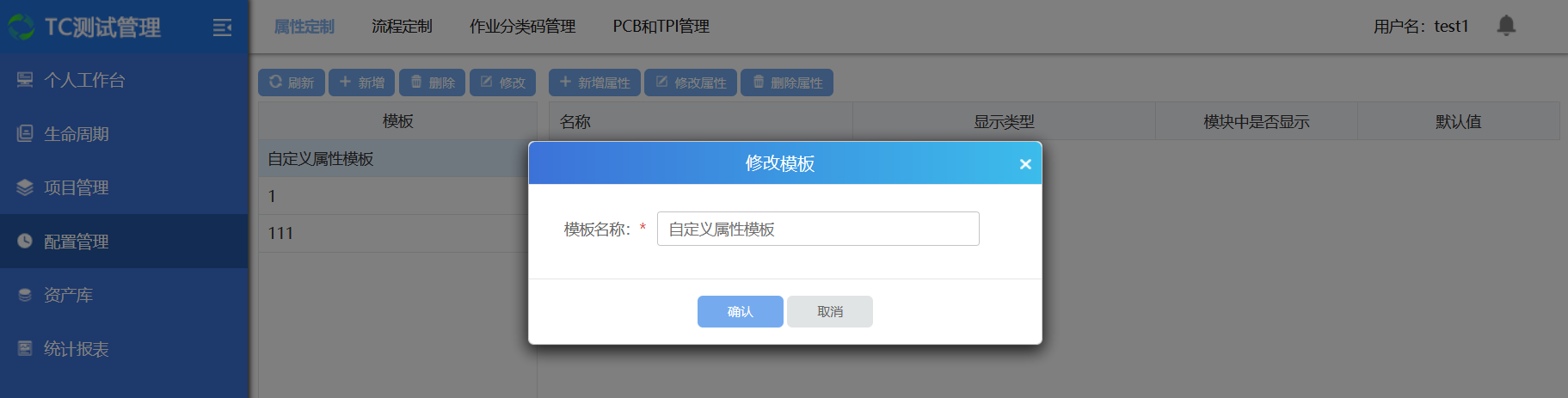 选中一个属性模板,点击修改,输入属性信息,确认后修改成功;