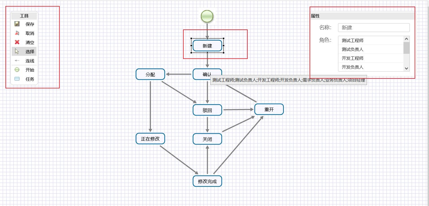选中一个未使用的流程点击流程图,更改内容后(可以修改任务节点、节点处理人、流程顺序、流程名称、角色组等),点击保存,流程修改成功;(已使用的流程不可修改)