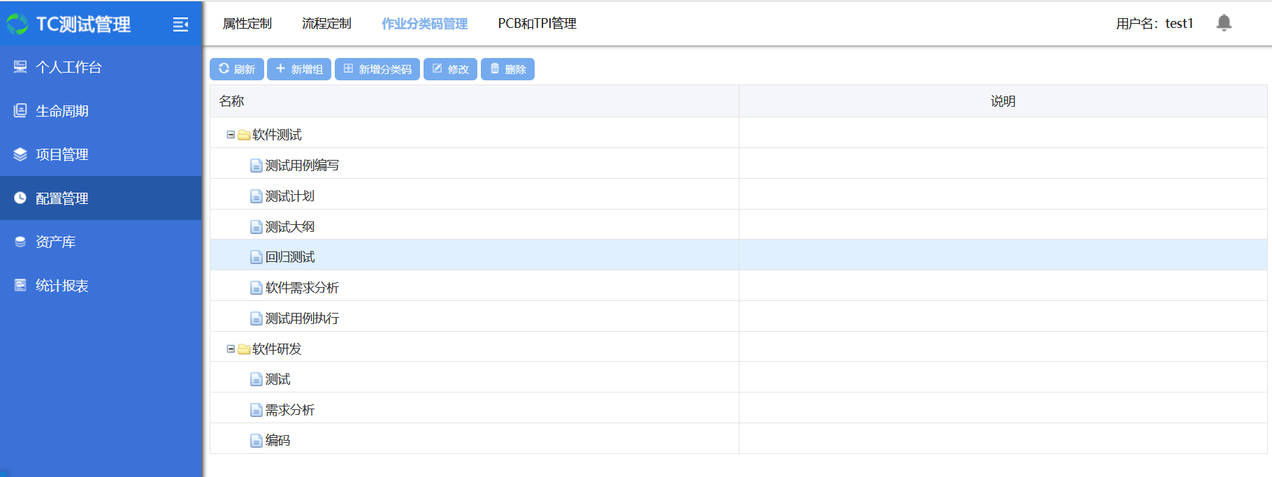 点击【作业分类码管理】进入到作业分类码管理模块,作业分类码管理模块主要包括了新增组、新增分类码、修改组/码、删除等功能。