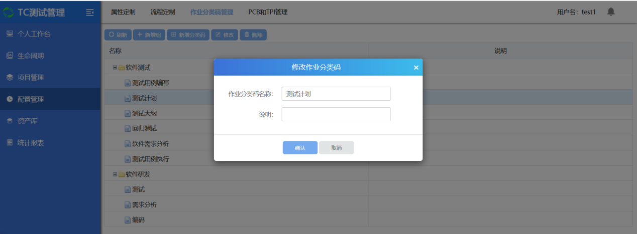 选中一个分类码组或者作业分类码,点击修改,弹出修改界面;输入修改内容后,点击确认,修改成功;