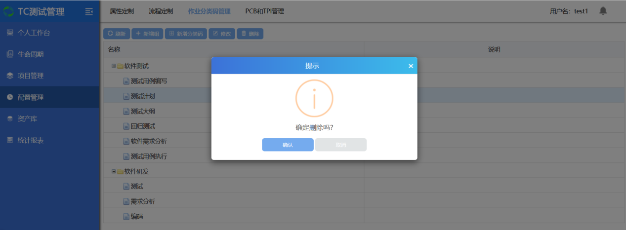 选中一个作业分类码,点击删除,确认后删除成功;(注:分类码组下有子节点的需要先删除子节点,再删除父节点);