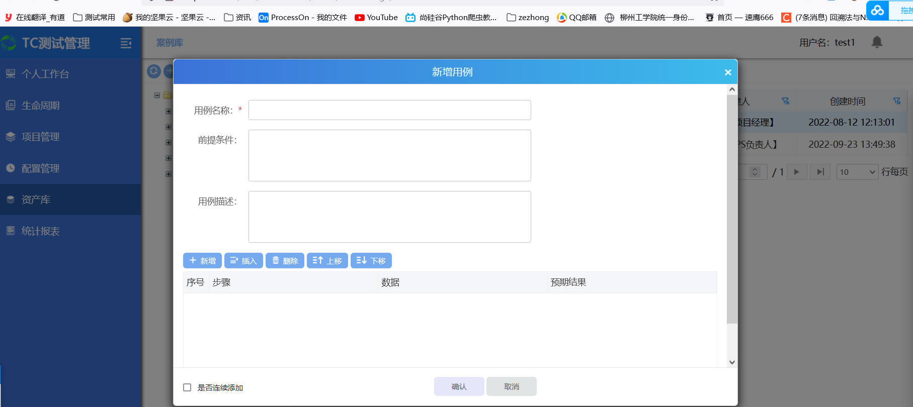 选中一个用例组,点击新增按钮,弹出新增用例界面,填写用例基本信息(名称、描述等)、步骤,即可新增用例成功;