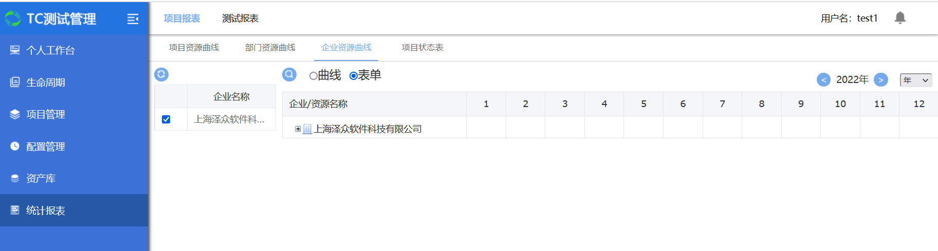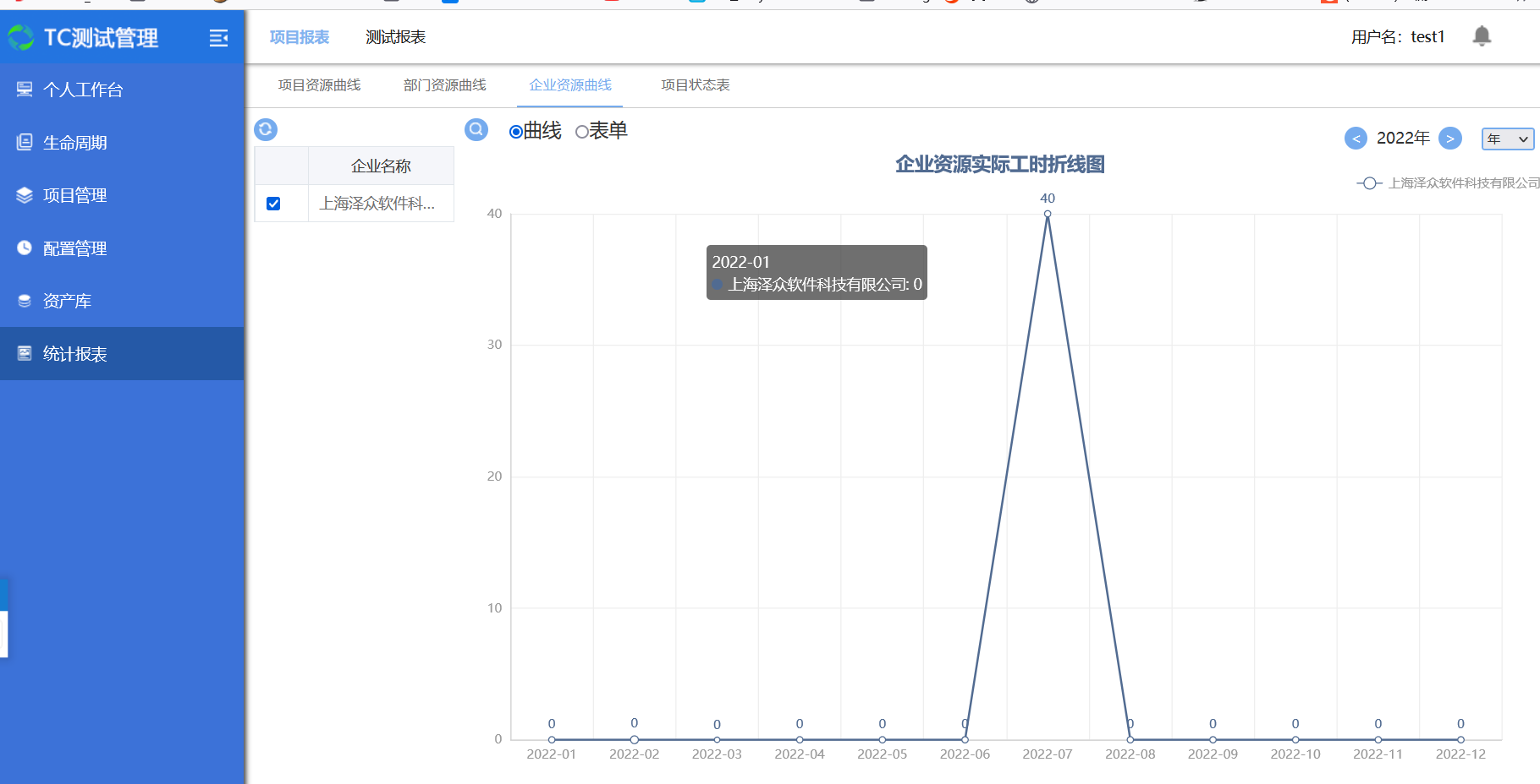 点击【企业资源曲线】进入到企业资源曲线模块,勾选至少一个企业,不超过3个企业,选择形式:曲线,点击搜索按钮。根据企业、月/年、时间,查询显示相应的报表信息,X轴与选择的企业对应的资源在此项目经理用户下所有项目作业对应的起末时间和月/年有关,Y轴与选择的企业对应的资源在此项目经理用户下的所有项目作业对应的报工(小时)有关,点击时间的左右按钮可查看相应时间的折线图。