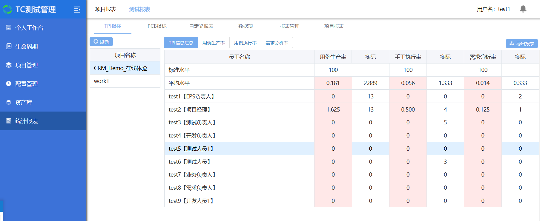 点击【测试报表】进入到测试报表模块。测试报表模块包含TPI指标、PCB指标、自定义查询报表、数据项和报表管理模块。测试报表主要是项目群管理人员根据项目进行查看各项目的缺陷报表、测试进度报表、各种测试指标、自定义报表等。方便项目管理人员事实把控各项目的测试进度情况。