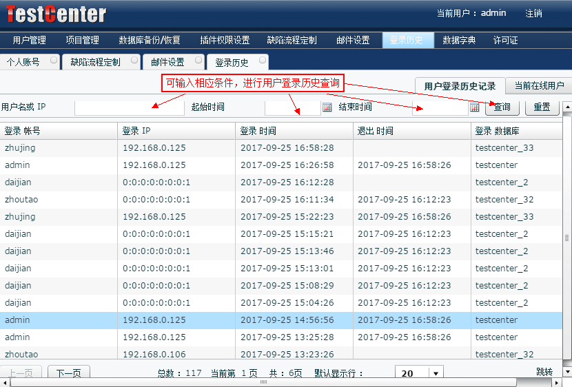 点击【登录历史】,进入登录历史模块,【登录历史】分为用户登录历史记录和当前在线用户。用户登录历史记录模块用来记录用户登录和退出系统的信息。