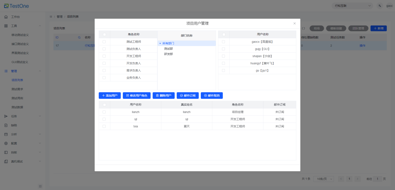 用户新建项目之后,选择新建的项目可以进行成员邀请,点击【团队管理】按钮,弹出“项目用户管理”窗口。