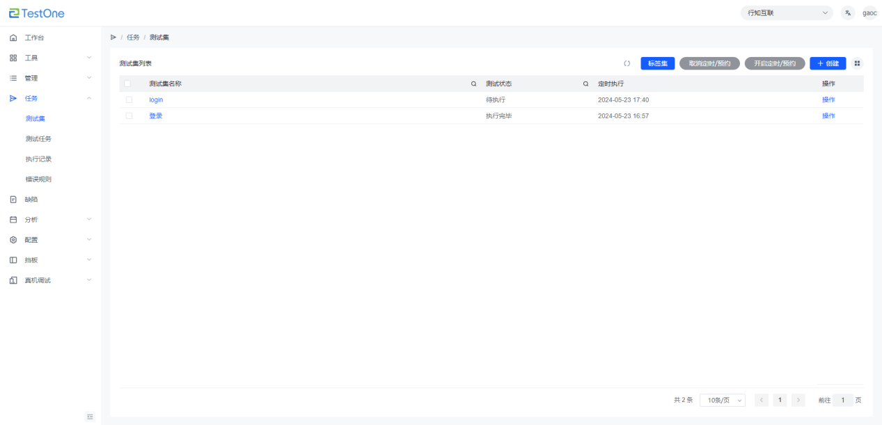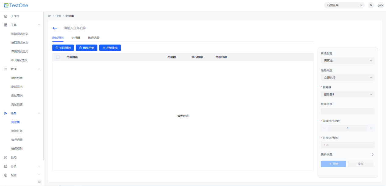 对于同一个项目下的测试用例,可以进入【任务】-【测试集】进行批量选择测试用例进行执行。