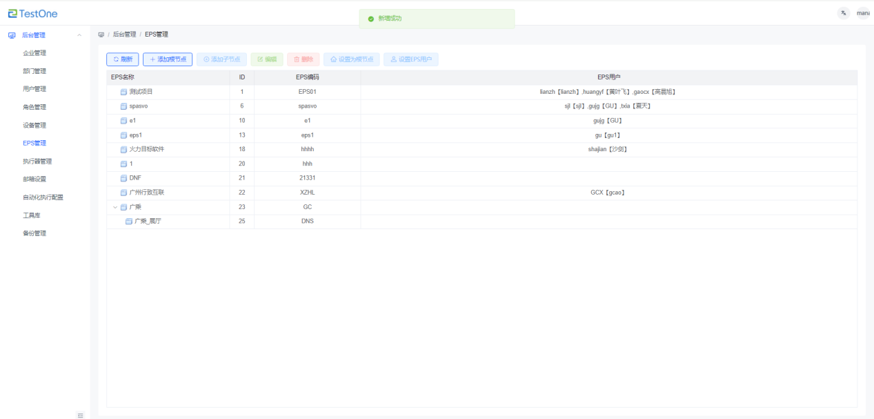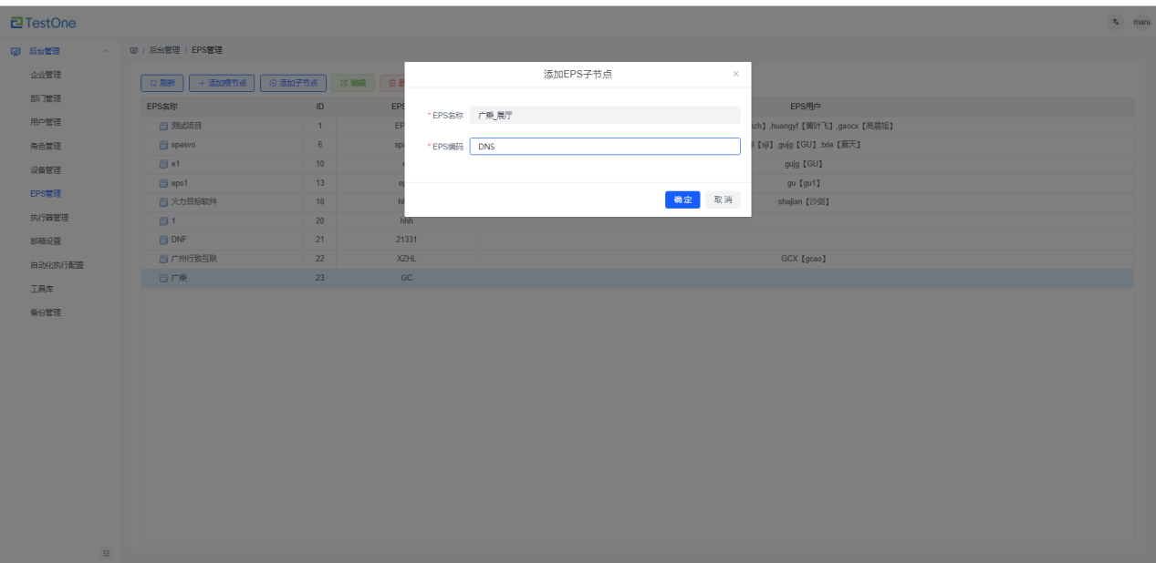 1)选中根节点,点击【添加子节点】按钮,弹出“添加EPS子节点”窗口;