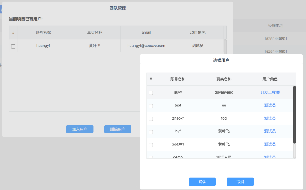 团队管理: 1)点击需要添加成员项目对应的【修改-团队管理】; 2)点击【加入用户】按钮; 3)勾选需要加入项目的用户,点击【确定】按钮加入项目; |