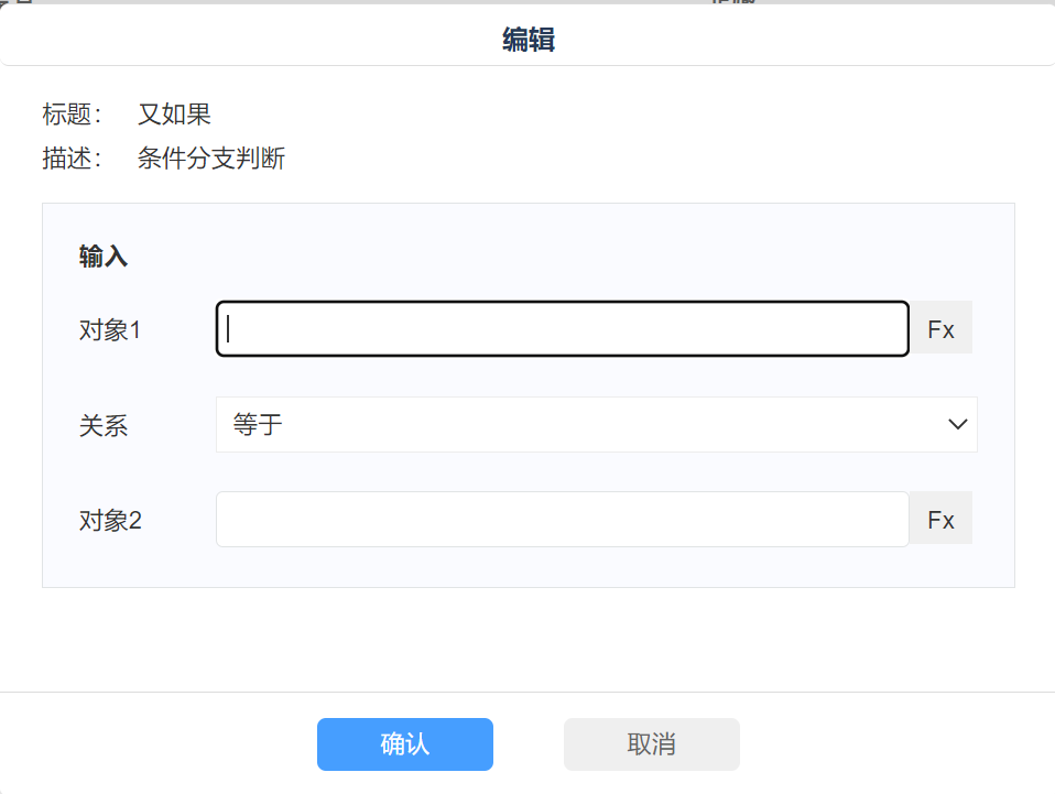 1)配置对象1; 2)选择关系; 3)配置对象2,当关系为“等于True”、“等于False”时无需选择; |