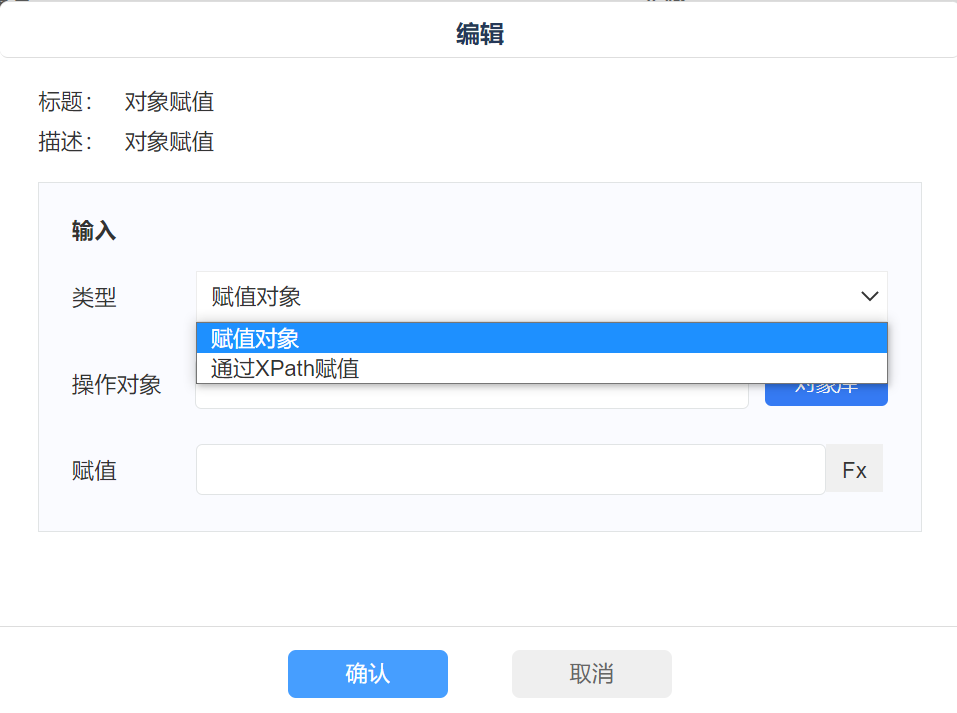 XPath:可手动输入XPath; Value:可手动输入,可通过【Fx】选择已配置的参数; |