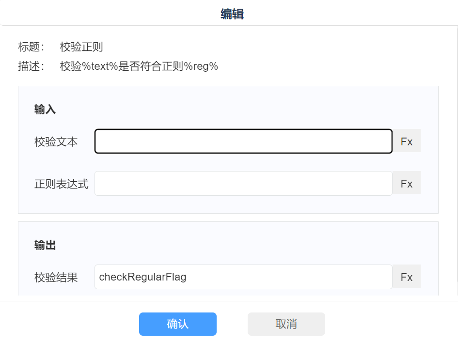 1)输入/选择校验文本; 2)输入/选择正则表达式; 3)定义输出参数名称; |