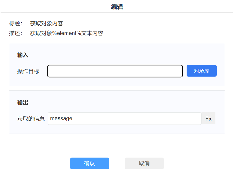 1)通过【对象库】选择需获取信息的对象 2)定义输出参数名称; |