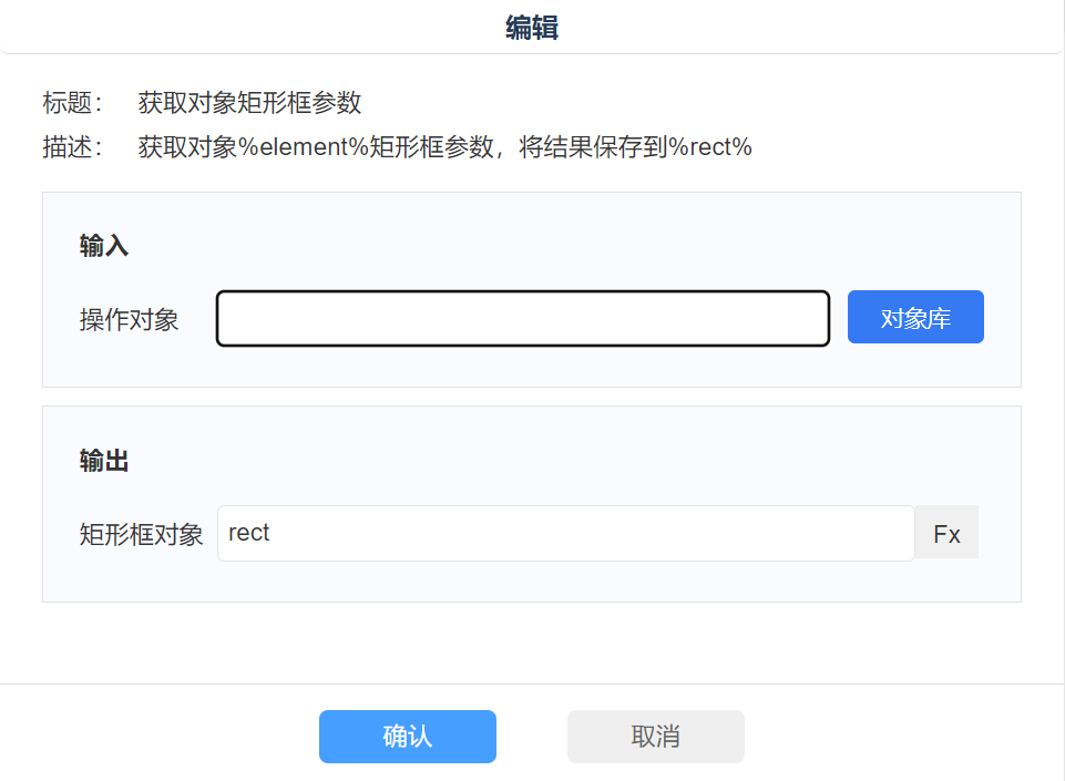 1)通过【对象库】选择需获取信息的对象; 2)输入/选择矩形框对象; |