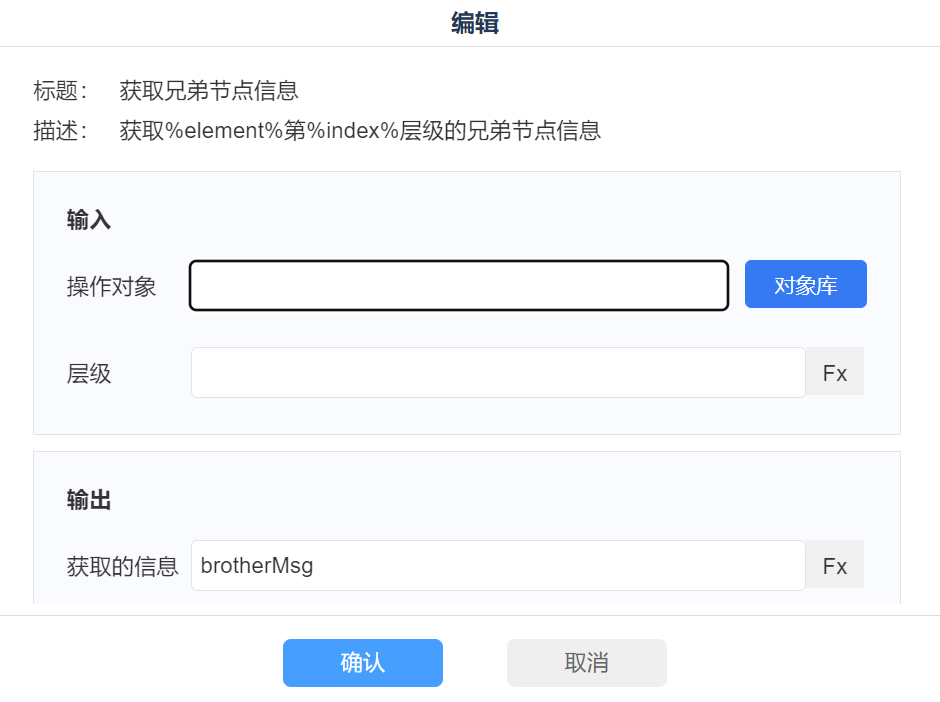 1)通过【对象库】选择需获取信息的对象; 2)输入/选择层级; 3)定义获取信息参数; |